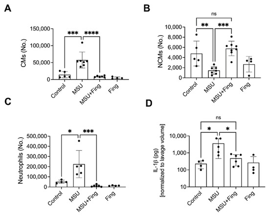 Fingolimod (Fing) treatment and influx of inflammatory classical monocytes (CMs), anti-inflammatory non-classical monocytes (NCMs), neutrophils and interleukin-1 beta (IL-1b) levels in the Murine Peritoneal Model of Acute Gout. (A) Fing reduced CMs. (B) Fing increased NCMs. (C) Fing reduced neutrophils. (D) Fing reduced IL-1b levels.