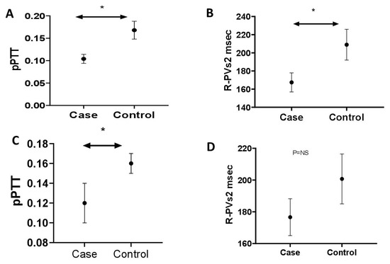 (A) pPPT is Significantly Reduced in Cases with Established PH. (B) R-PVs2 is Significantly Reduced in Cases with Established PH. (C) pPTT is Significantly Reduced in Cases with Hyperuricaemia. (D) R-PVs2 is Reduced in Cases with Hyperuricaemia. * p ≤ 0.05, NS = Non-significant.