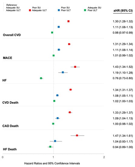 Association of serum urate control and urate-lowering therapy administration with the risk of cardiovascular events in patients with gout. Adjusted hazard ratios (aHR) and 95% confidence intervals generated using multivariable Cox regression adjusted for age, sex, race, ethnicity, body mass index, smoking status, and comorbidities: myocardial infarction, stroke, hypertension, diabetes, lung disease, cancer, fracture, ulcer, and chronic kidney disease. Time-varying gout treatment status defined in one-year intervals. Adequate serum urate (SU) defined as <6 mg/dL. Adequate urate-lowering therapy (ULT) defined as at least two pharmacy dispensings of 90-days or greater of allopurinol, febuxostat, or probenecid. Abbreviations: aHR, adjusted hazard ratio; CAD, coronary artery disease; Cl, confidence interval; CVD, cardiovascular disease; HF, heart failure; MACE, major adverse cardiovascular events; SU, serum urate; ULT, urate-lowering therapy.