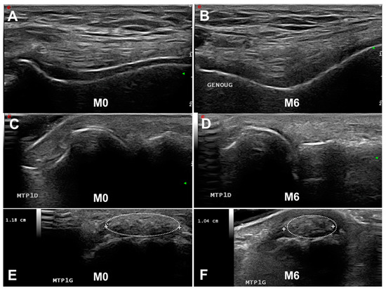 Figure 1. Follow-up of ultrasonography (US) and dual-energy CT gout lesions. (A,C,E). Baseline US features of gout with a double contour (DC) sign on the knee (A) and first metatarsophalangeal joints (MTP1s) (C) and a tophus on the MTP1s ((E), dotted oval). After 6 months of urate-lowering therapy, the disappearance of the DC sign (B,D) and slow decrease in tophus volume (F). M, month. - Tophus: “a circumscribed, inhomogenous, hyperechoic and/or hypoechoic aggregation (which may or may not generate a posterior acoustic shadow)” (Figure 1E,F). The main locations for detecting US tophus are the MTP1s and quadricipital and patellar tendons.