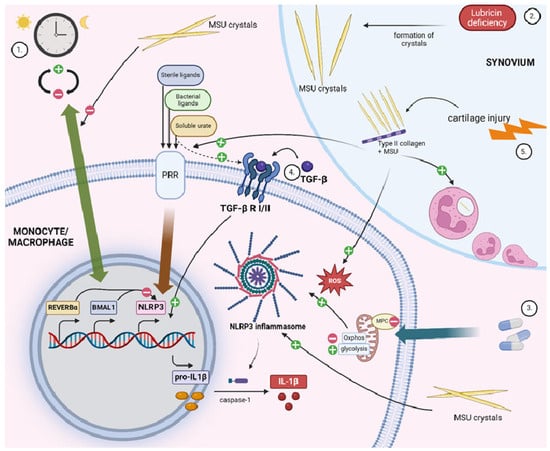 While NLRP3 inflammasome activation is recognized as a pivotal mechanism in gouty inflammation, the specific reason why flares occur disproportionately during night-time or early morning remains unknown. Popov et al. [6] sought to investigate whether MSU crystals induce changes in the circadian clock of THP1 macrophages in vitro. Clocks were synchronized within the cell population by serum starvation followed by re-feeding with serum-supplemented media (in the presence or absence of MSU crystals). MSU-exposed THP1 macrophages exhibited increased expression of the negative limb components PER2 and CRY1. The positive limb component BMAL1 and auxiliary component REV-ERBα, which have a role in NLRP3 repression, also showed an altered expression pattern, and although this was not as consistent throughout all time points, overall, BMAL1 and REV-ERBα protein levels were decreased across the 24 h period.