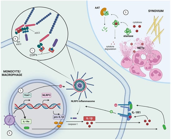 Highlights of anti-inflammatory mechanisms and potential new therapeutic development in gout. (1) CARD-only proteins (COPs) competitively bind to caspase recruitment domains (CARD) and hinder interactions needed for inflammasome activation. (2) TNFR-associated factor 1 (TRAF1) acts as a negative regulator of inflammasome activation. (3) Monosodium urate (MSU) crystals formed within the synovial space trigger neutrophil recruitment and activation, eventually leading to the release of neutrophil extracellular traps (NETs). Neutrophil elastase is capable of degrading cytokines, thereby limiting inflammatory response. α1-antitrypsin (AAT) counteracts this by degrading elastase. (4) Bat ASC2, lacking the caspase-recruiting-domain, potently inhibits NLRP3 inflammasome activity. (5) Lentivirus-mediated gene transfer generates stable interleukin-1 receptor antagonist (IL-1Ra) production as a means to suppress IL-1R1 receptor activation. Figure created with BioRender.com.