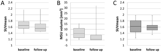 Results of patient-level and vessel-level analysis with paired t-tests and mixed-effects-model analysis, respectively. Positive difference (baseline–follow-up) represents decrease in value at follow-up. At the vessel level, we observed a statistically significant decrease in SUVmean (p = 0.0003) and SUVmax (p = 0.0090) at follow-up and a trend towards a decrease in TBRmean, TBRmax, and MSU volume at follow-up (not statistically significant).