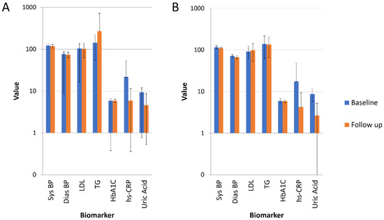 (A) Analysis of blood biomarkers for all patients before (baseline) and after Pegloticase infusions (follow-up). By paired t-tests, uric acid is the only marker that drops significantly after treatment (p = 0.006). (B) In a sub-analysis of patients who completed at least 10 infusions, uric acid remains the only statistically significant change (p = 0.027). Biomarkers [units]: Sys BP = systolic blood pressure [mmHg]. Dias BP = diastolic blood pressure [mmHg], LDL = low density lipoprotein [mg/dL], TG = triglycerides [mg/dL], HbA1c = hemoglobin A1c [%], hs-CRP = high-sensitivity C-reactive protein [mg/L], uric acid [mg/dL].