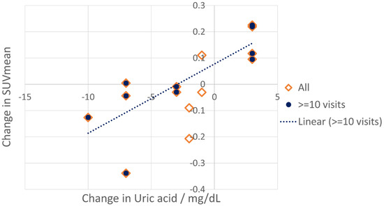 Correlation between changes from baseline to after treatment in 18F-FDG uptake (SUVmean) in vessel segments showing MSU-coded deposits and in uric acid. Moderate correlations were found for all patients with vessel segments showing MSU deposits (R2 = 0.51) and for patients completing at least 10 visits (R2 = 0.65).