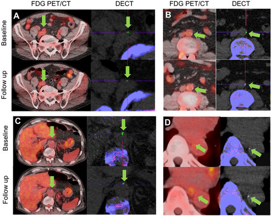 Image analysis of PET/CT data was performed as previously described using OsiriX MD (Pixmeo, Geneva, Switzerland) [45]. CT images extending from the level of the carotid artery bifurcation in the neck through the mid-lower extremities were fused with 18F-FDG PET images of the same regions and analyzed in the axial plane. The following target arteries were analyzed: bilateral common carotids, ascending thoracic aorta, descending thoracic aorta, abdominal aorta, bilateral common iliacs, and bilateral femorals. Regions of Interest (ROIs) were manually drawn along the outer boundary of each vessel in the axial plane on the fused images, avoiding PET signal spillover from adjacent structures. The mean and maximum Standardized Uptake Values (SUVs)—a dimensionless parameter indicative of tracer uptake—in each slice (SL) were recorded: SUVmeanSL and SUVmaxSL. In each vessel, several ROIs were drawn on consecutive axial slices as follows: (1) common carotids—just proximal to the bifurcation and extending caudally for a maximum attempted length of 7.5 cm, (2) ascending aorta—just caudal to where the aorta begins to elongate into the arch and extending toward the aortic root to the level where the right atrium is visible, (3) descending thoracic aorta—just caudal to where the aorta elongates from the arch and extends toward the abdomen through the level of the lung fields, (4) abdominal aorta—continuing through to its bifurcation, (5) bilateral common/external iliacs up to the inguinal ligaments, and (6) bilateral femoral arteries from the level where the vessel enters the axial plane for 10 cm caudally. Values for each vessel segment were subsequently reported as SUVmean[vessel] and SUVmax[vessel] by averaging over all slice values in a segment, and finally, values for each patient were reported as SUVmean and SUVmax by averaging over all slices in all vessels. In addition, a Target-to-Background ratio (TBR) was calculated for each slice by normalizing each arterial SUV measure to the background uptake defined as the average SUVmean in the blood pool of nearby veins, i.e., internal jugular veins, superior vena cava, and inferior vena cava. The background was the average SUVmean over 10 slices of ROIs ≥25 mm2 drawn in the relevant vein. Anatomical landmarks were used to provide consistency in vessel segments analyzed from baseline to follow-up.