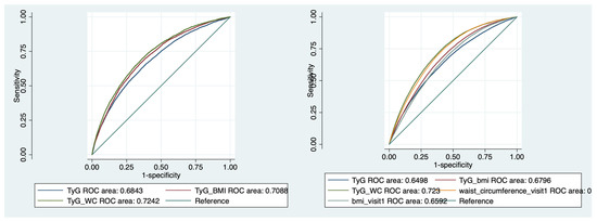 - Abstract *: Objectives: Several studies have shown associations between gout and insulin resistance. The triglyceride–glucose (TyG) index is a simple but reliable surrogate marker for insulin resistance. We aimed to explore the connection between gout and TyG indices in a multi-ethnic cohort study. Methods: The TyG index is defined as log(triglyceridesxglucose/2), the TyG–waist circumference (TyG–WC) index is defined as TyGxWC. This study included 8167 gout-free adults from the Ansan and Ansung cohorts in the Korean Genome and Epidemiology Study (KoGES), followed for 18 years (2011–2020), and 55,000 gout-free white adults from the UK Biobank (UKBB) with at least two urate follow-up measurements. Incident gout was identified using ICD M10 codes in the UKBB and self-reported cases in KoGES. We employed the Cox proportional hazards model and conducted sensitivity analyses to evaluate the association. Results: Prevalent gout rates were 6.1% in the KoGES cohort and 6.0% in the UKBB. The area under the receiver operating characteristic curve (AUROC) for the TyG index when detecting prevalent gout at baseline was 0.68 in KoGES and 0.65 in the UKBB. For the TyG–waist circumference (TyG–WC) index, AUROC values were 0.72 in both KoGES and the UKBB (Figure 13). The incident gout rate was 0.7 cases per 1000 person years in KoGES and 0.8 in the UKBB (Figure 14). The cut-off for the fourth quartile (Q4) of the TyG index was 9.02 in KoGES and 8.99 in the UKBB. The risk of gout for those in TyG Q4 was 2.29 times higher in KoGES and 2.41 times higher in the UKBB compared with those in Q1 (Table 11). For the TyG–WC Q4, the risk of gout was 2.91 times higher in the UKBB. Conclusion: The TyG index is a significant risk factor for gout and becomes even more predictive when combined with waist circumference. These findings are valuable for both clinicians and epidemiologists, offering a straightforward method for assessing gout risk.