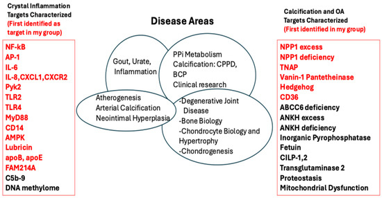 Discovering target molecules and pathways involved in both disease and tissue homeostasis has been the primary focus of my basic-translational research (Figure 1). This work channeled the tenets of my research philosophy and efforts. Furthermore, my group, and global network of collaborators, went beyond gout and other forms of crystal arthropathy to the analysis of specific comorbidities of gout, CPPD, and pathologic calcification associated with deposition of basic calcium phosphate crystals. These studies ranged from degenerative joint disease associated with dysregulated chondrocyte biology to atherogenesis, arterial calcification, and how arteries react to injury in the process of neointimal hyperplasia.
