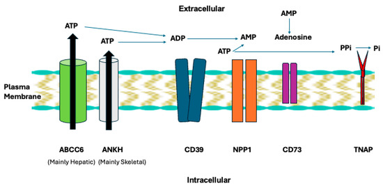 NPP1 and TNAP in the plasma membrane enzyme and transporter chain that regulates extracellular ATP and generation of AMP, adenosine, PPi, and inorganic phosphate (Pi). The broad physiological functions of this chain are discussed in the text. Image of plasma membrane via Good Free Photos https://www.goodfreephotos.com/.