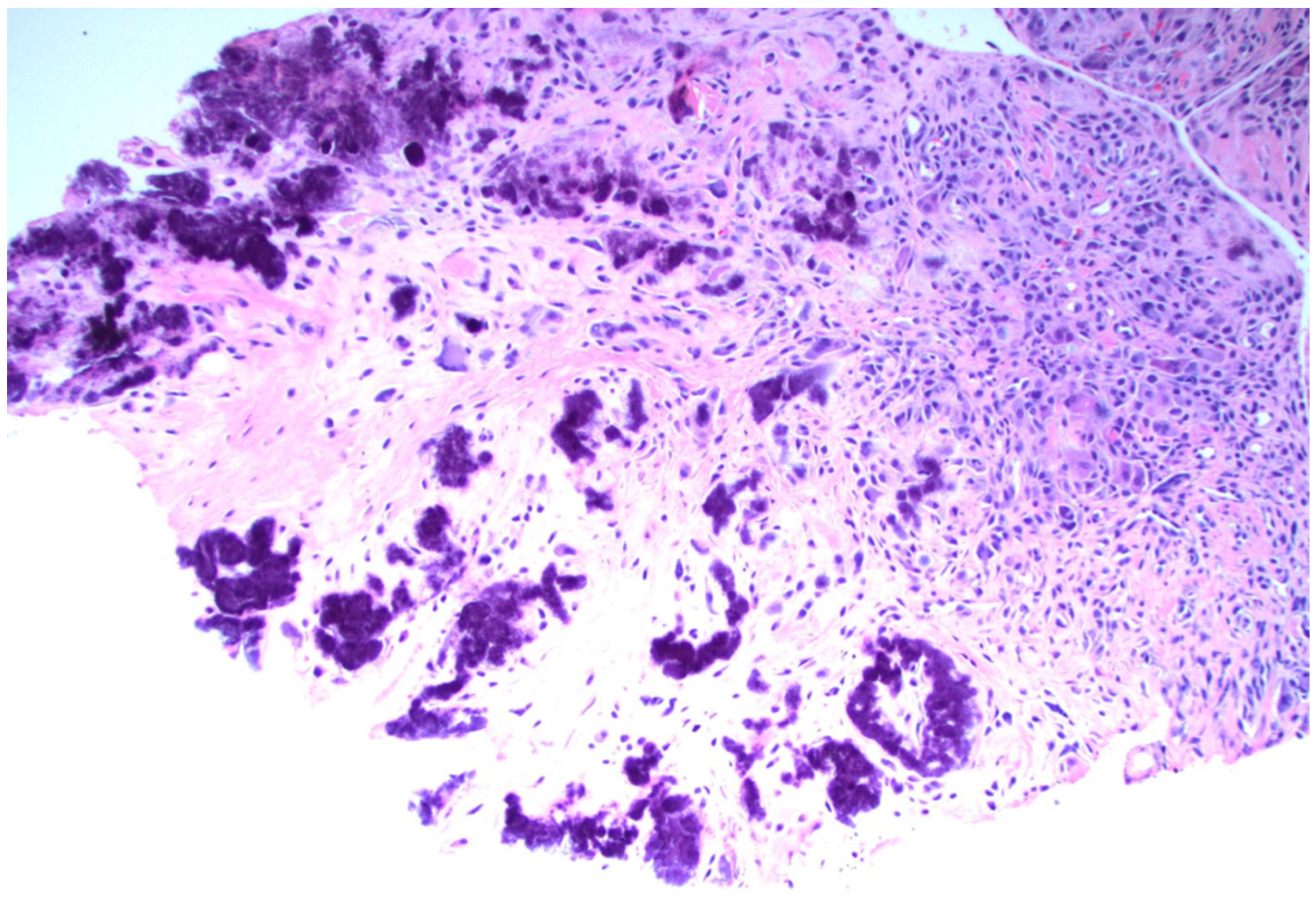 - Shidham, V.; Chivukula, M.; Basir, Z.; Shidham, G. Evaluation of crystals in formalin-fixed, paraffin-embedded tissue sections for the differential diagnosis of pseudogout, gout, and tumoral calcinosis. Mod. Pathol. 2001, 14, 806–810. [Google Scholar] [CrossRef]