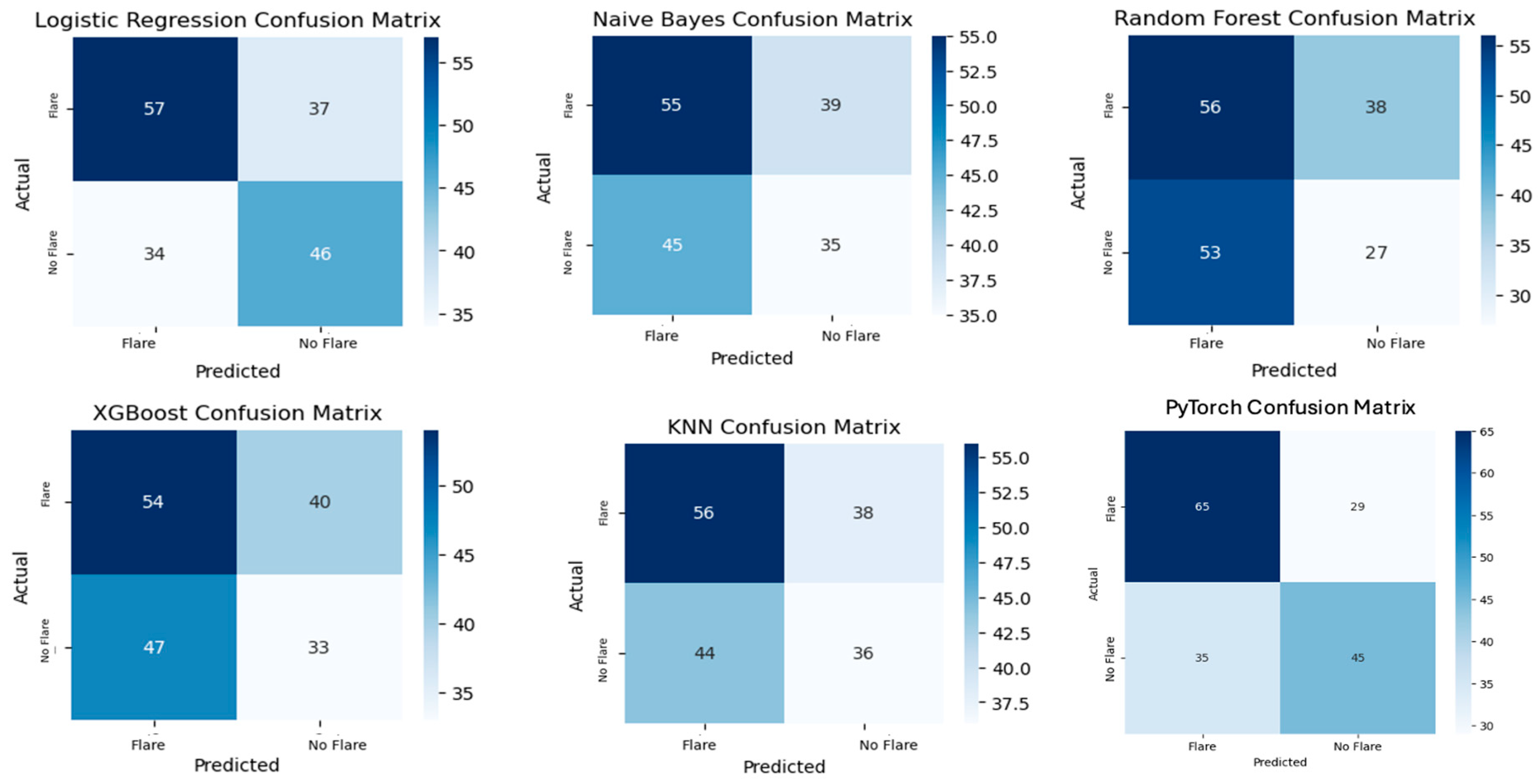 - Abstract: Background: Urate-lowering therapy is an effective treatment for gout if properly dosed and if serum urate levels below 6 mg/dL are achieved and maintained [1]. Nevertheless, people properly treated for gout may still flare, for reasons largely unknown. Most people with gout are unable to identify a trigger for their gout flares; hence, their unpredictable nature represents a significant therapeutic challenge [2]. If gout flares in the future were predictable, prophylactic therapy could be extended in individuals at high risk for future gout flares. Objective: To use machine learning methods and circulating transcriptomic features to predict gout flares. Methods: Our work aims to investigate the feasibility of predicting gout flares based on gene expression counts derived from peripheral blood samples. RNA and clinical data were obtained from a subgroup of the STOP Gout (NCT02579096) clinical trial [3]. The current analysis utilized RNA obtained from 174 participants sampled at week 48. For six months thereafter, flares were observed during the flare monitoring period. The primary outcome was at least one flare. We implemented and evaluated six machine learning models to predict the primary outcome. We evaluated the predictive ability of the models with AUC using 10-fold cross-validation. RNA transcripts selected for prediction (between 700 and 1000 per training set) were differentially expressed between flare and no flare groups (p-value < 0.05; independent T-test). Results: The prediction accuracy of the PyTorch v2.9.0 neural network model (a machine learning algorithm implemented in Python and developed by Meta) was the highest and XGBoost was the lowest compared to other models. Of the 174 subjects, 94 participants flared during the outcome observation period. The neural network predicted 100 flares, of which 65 predictions were correct, resulting in a positive predictive value (PPV) of 65%. XGBoost predicted 101 flares, of which 54 were correct predictions, resulting in a PPV of 53% (Figure 1; Table 1). The neural network achieved a 65.3% AUC across the average of 10 fold cross validations, outperforming other models and classification approaches tested. The PyTorch neural network model resulted in higher AUCs vs. logistic regression (59.8%), naïve Bayes (57.1%), random forest (51.1%), XGBoost (50.2%), and K-nearest neighbor (53.3%). Conclusions: This is the first application of an omics-enabled machine learning predictive tool for future gout disease activity. The results demonstrate that gene expression data contains signals predictive of the onset of gout flares. Recently obtained clinical and demographic data from Stop Gout will allow us to calculate the increase in AUC when adding omics to a base flare prediction model. The findings support the potential utility of transcriptomic biomarkers in developing predictive tools for clinical decision-making.