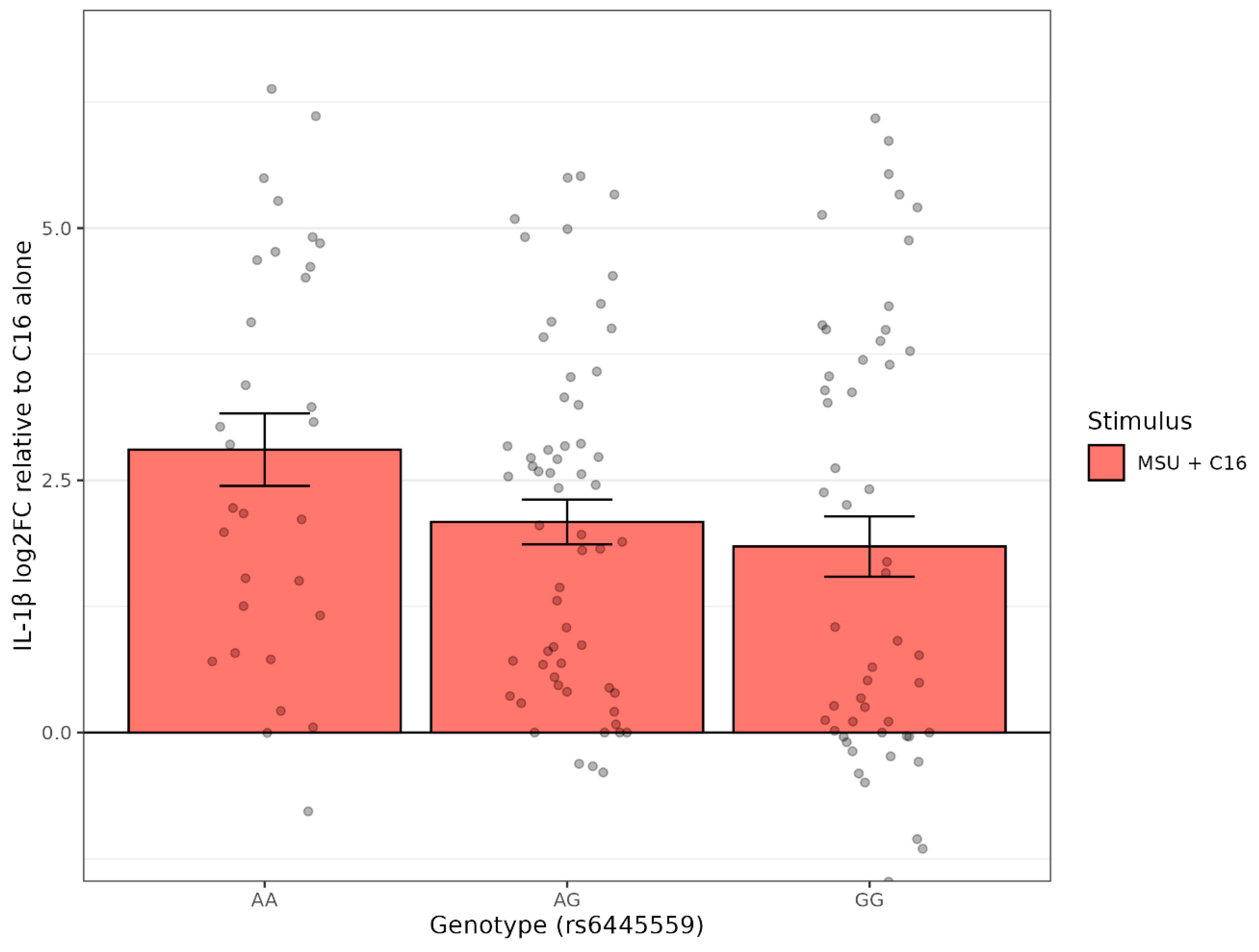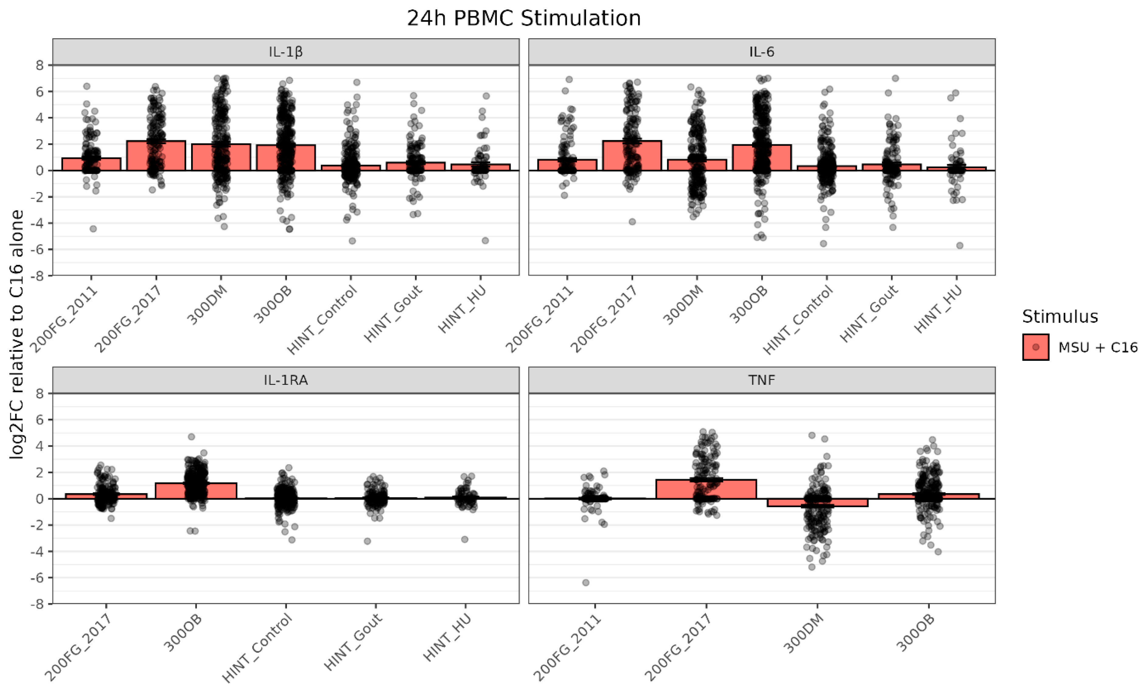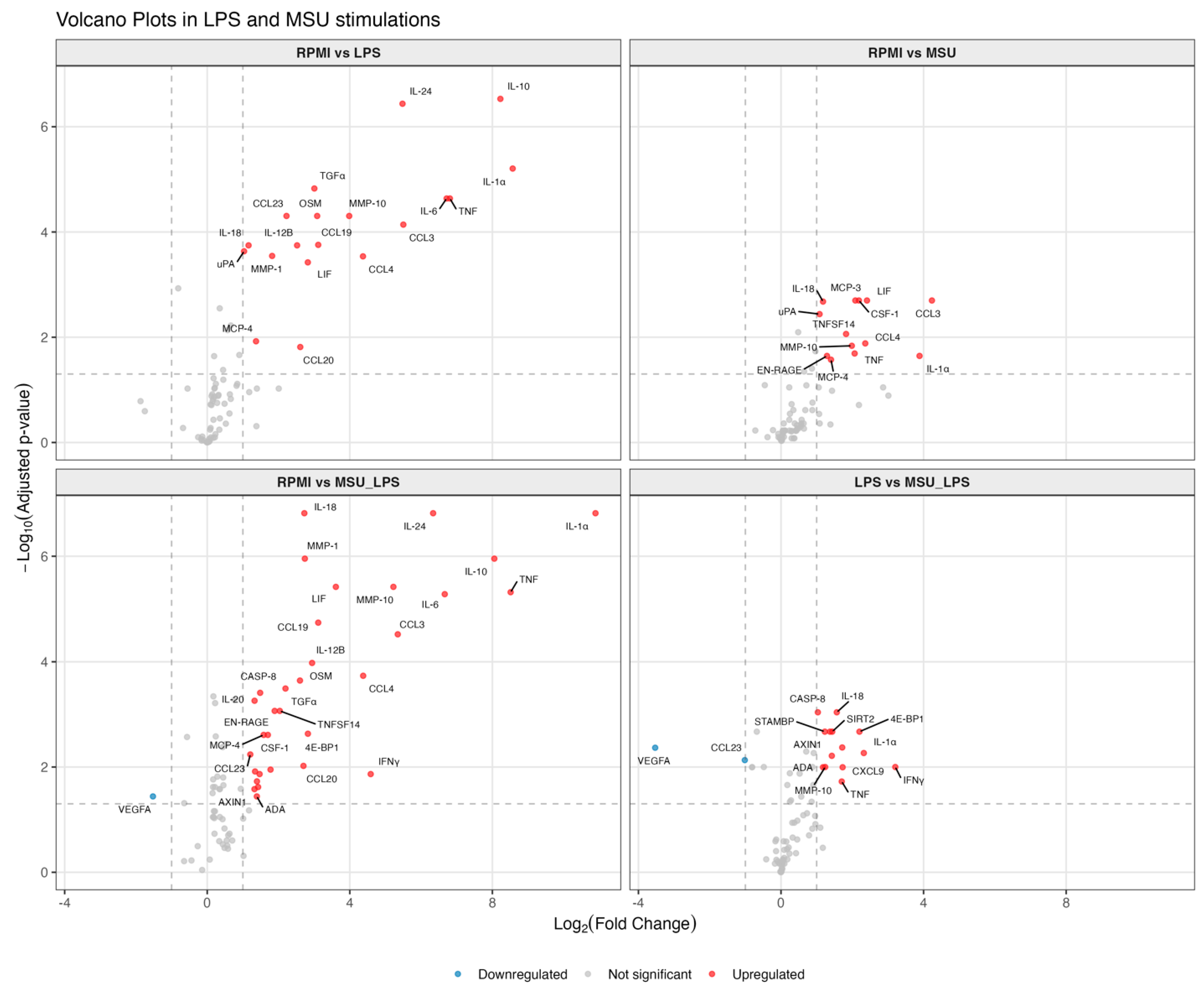 - Abstract: Background: Gout is characterized by inflammatory flares caused by intra-articular monosodium urate (MSU) crystal deposition and innate immune activation. A recent genome-wide association study (GWAS), including >120,000 gout patients, identified >350 genetic loci. Some of these variants are associated with gout but not hyperuricemia, pointing to genes involved in the immune response. We focus here on non-coding RNAs (ncRNAs) controlling the transcription of putative gout flare-related genes. A previously unidentified expression QTL identified the CSF1−CSF1R axis. The role of colony-stimulating factor 1 (CSF1) in immunity remains controversial, with both pro- and anti-inflammatory functions reported [1–3]. These dual properties may contribute to gout flare progression, making its regulatory ncRNAs (immune-priming lncRNA (IPL)) and sense and antisense enhancer RNAs (eRNA) key modulators (Figure 2). Our goal is to target these ncRNAs to modulate inflammation. Methods: We first validated a robust detection assay of IPL, eRNA, and CSF1 in PMA-stimulated THP-1 cells using digital droplet PCR (ddPCR). We then transitioned to peripheral blood mononuclear cells (PBMCs) from 10 healthy, European white males (>50 years old). These cells were stimulated with MSU crystals with and without LPS. As the negatively charged crystal surfaces interfered with commercial RNA isolation kits—causing contamination and selection bias—we established a protocol using classical Chloroform-RNA extraction followed by a bead-based clean-up. Analyses include ELISAs, total RNA sequencing, Olink proteomics, and ddPCR on subcellular fractions, with nuclear RNA subject to further division. Results: Using THP-1 cells, both the IPL and eRNA showed an initial transcription peak at 4 h, supporting a regulatory function, while their targets, CSF1 and CSF1R, became continuously upregulated over 96 h. In PBMCs, we found that 4 h MSU crystal stimulation alone upregulated CSF-1 along with its associated sense and antisense eRNA. Interestingly, this upregulation was abrogated by co-stimulation with LPS. The increase in CSF-1 was still present at 8 h, but the signal for its potential eRNAs vanished, suggesting a transient regulatory action. The IPL was consistently below the detection limit (<0.5 copies/µL) in all primary cell settings. Olink proteomics data confirmed the MSU crystal-driven regulation of CSF1 (Figure 3) and revealed novel protein hits for both MSU crystal and MSU crystal + LPS stimulation. Conclusion: This study explores CSF1 and its low-abundant ncRNAs in gout, highlighting key molecular considerations from RNA isolation to cell type. Our ongoing work with PBMCs, using RNA-seq and Olink proteomics, aims to elucidate drivers of gout. Initial Olink analysis implicates novel proteins, including CSF1, in the MSU crystal response, supporting further investigation into the CSF1 axis and its role in the inflammatory MSU crystal response and finally in gouty arthritis.