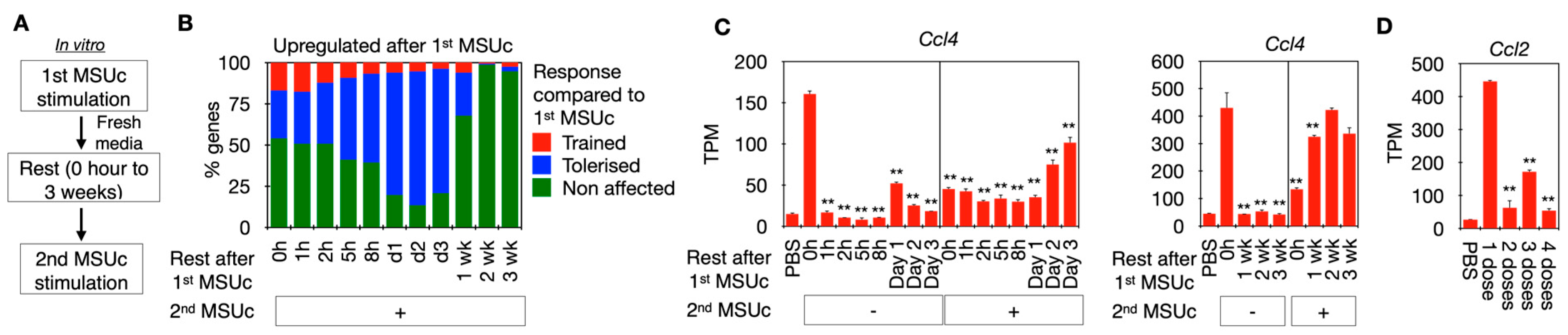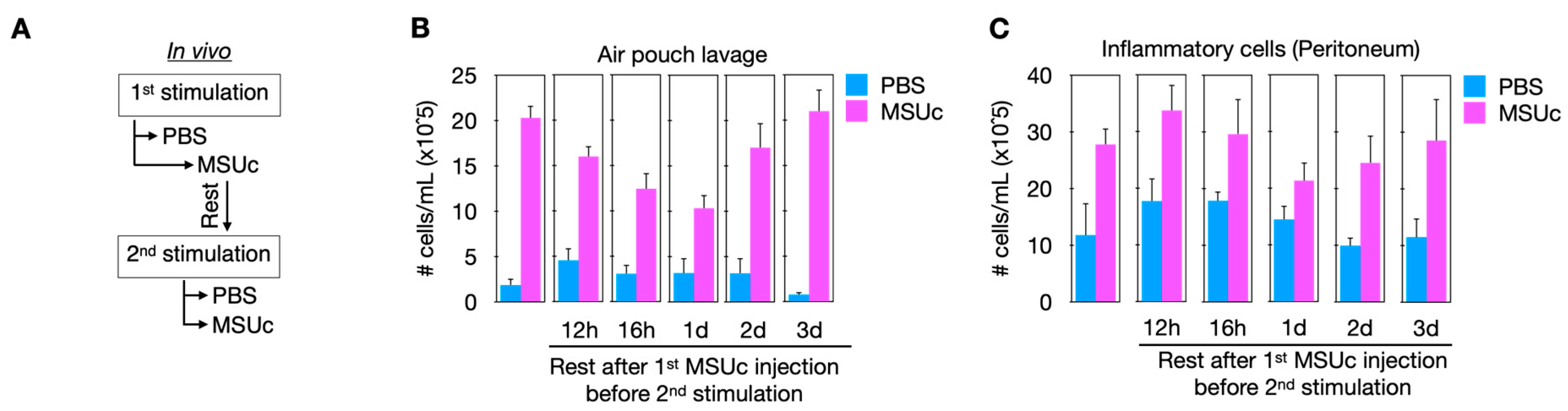- Abstract: Background: Gout is associated with increased cardiovascular morbidity, including atherosclerosis, yet the immunologic mechanisms remain unclear. We hypothesized that the enhanced atherosclerotic burden in gout patients is driven by local immune activation in response to monosodium urate crystal (MSUc) deposition. Methods: To investigate this, we injected MSUc or PBS into the air pouch of atherosclerosis-prone Ldlr−/− mice fed a Western diet using two injection protocols: Protocol A (Mon/Wed/Fri) and Protocol B (Mon/Tue/Fri). Results: Oil Red O staining and aortic root histology revealed significantly increased lesion area in both groups, with Protocol A inducing more extensive atherosclerosis (Figure 5). These differences occurred without changes in circulating cholesterol, implicating inflammatory timing rather than lipid burden. To assess how prior MSUc exposure alters inflammatory response to rechallenge, we performed sequential MSUc injections following rest intervals of 12 or 16 h, or 1, 2, or 3 days. Remarkably, prior exposure conferred transient protection against secondary challenge, with reduced leukocyte recruitment at 12–24 h and a return to baseline by 48–72 h (Figure 6). Similar tolerance was observed following intraperitoneal MSUc, suggesting systemic coordination. These findings indicate MSUc induces a short-lived innate immune memory response, functionally resembling macrophage tolerance that might be implicated in MSUc-enhanced atherosclerosis. To probe this tolerance mechanistically, we stimulated bone marrow-derived macrophages (BMDMs) with MSUc once or twice, separated by rest intervals ranging from 0 h to 3 weeks. We defined tolerance as reduced inflammatory gene induction upon re-stimulation, and training as amplification of gene expression. Of genes upregulated during the first MSUc exposure, 29% were tolerized and 16% trained after a second exposure (Figure 7). Trained responses diminished by day 3, while tolerance persisted and gradually returned to baseline by 1–2 weeks. Strikingly, tolerance was maintained even after four sequential 5-h MSUc stimulations, indicating a non-exhaustible regulatory program. Conclusions: These findings suggest that MSUc induces a unique state of macrophage adaptation that tempers subsequent inflammatory responses and modulates atherogenic progression. Understanding the molecular underpinnings of this tolerogenic program may uncover new therapeutic strategies aimed at promoting protective immune reprogramming to limit vascular inflammation in gout-associated atherosclerosis.