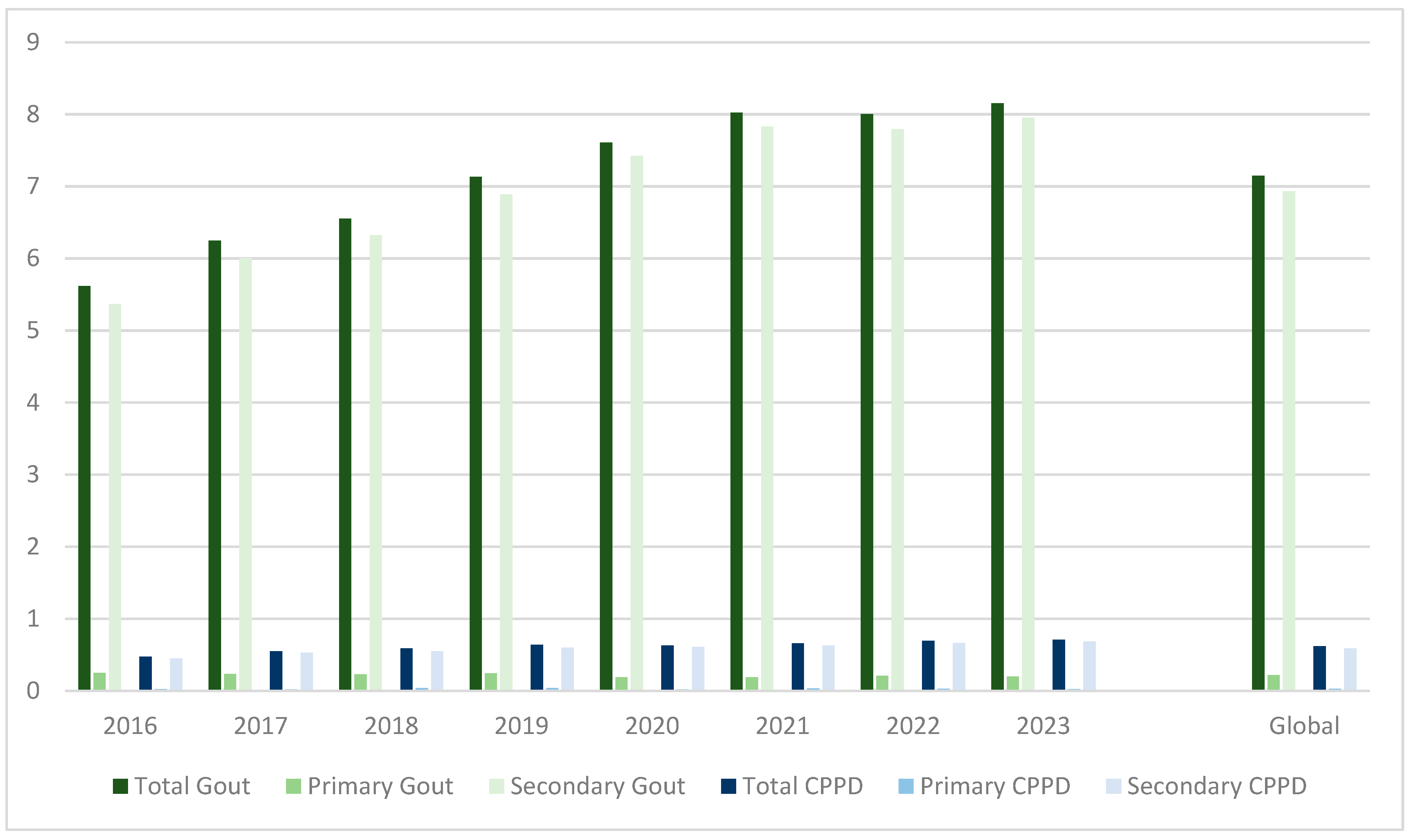 | Gout (total) | 5.617 | 6.245 | 6.551 | 7.131 | 7.609 | 8.020 | 8.000 | 8.154 | 7.148 |