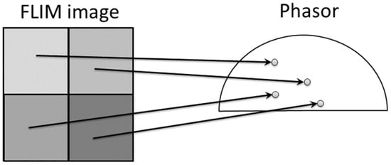 Another popular approach for analyzing lifetimes without fitting is the Phasor approach [6,19]. It provides a 2D graphical view of lifetime distributions. A phasor diagram is derived from the TCSPC data using a Fourier transform, and each pixel in the image corresponds to a point in the phasor diagram, as shown in Figure 2. The phasor space is constructed by two phasor vectors (G, S).