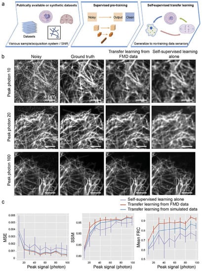 Performance of transfer learning in denoising: (a) Schematic of the transfer learning method. (b) Synthetic noisy images from microtube confocal images and corresponding denoised images with transfer learning denoising from pre-training using FMD dataset and compared to self-supervised denoising without pre-training. (c) The denoising performance, in terms of “Mean square error”, “Structure similarity index”, and “Mean Fourier ring correlation as a function of the synthetic noisy image”. Reprinted with permission from [36] under the terms of the OSA Open Access Publishing Agreement.