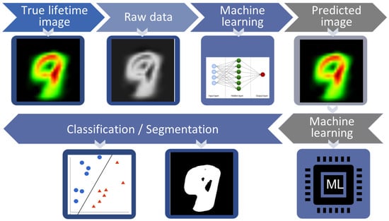 Schematic diagram of data modeling: First, true lifetime images were extracted from raw data by conventional methods like maximum likelihood method and least-square fitting. The machine learning model was then used to predict lifetime parameters. Afterward, machine learning was used for classification and segmentation. By segmentation region of interest (ROI) has been separated from background and in classification hyperplane divides data into different classes.