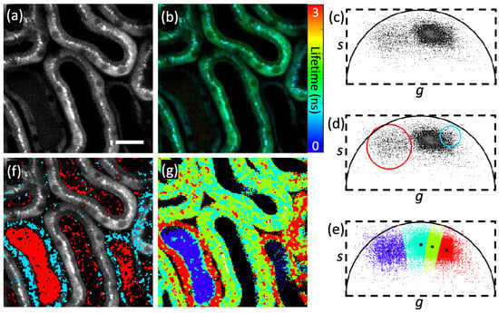 This image shows segmentation method by phasor plot: (a) two-photon intensity image; (b) fluorescence lifetime image; (c) phasor plot; (d,f) phasor labeling. Similar fluorescence decays have same features, so they cluster together. Here, red and blue color clusters are selected manually by users and this label their corresponding pixels in the image with certain colors; (e,g) clustered images (each color in g represents the one cluster). Reprinted with permission from [37] © The Optical Society.