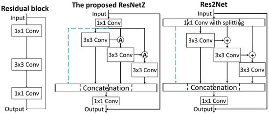 Schematic diagram shows the different architectures of ResNet, ResNetZ, and Res2Net. The proposed network and Res2Net have a shortcut connection. Reprinted with permission from [46] under the terms of the CC-BY 4. license.