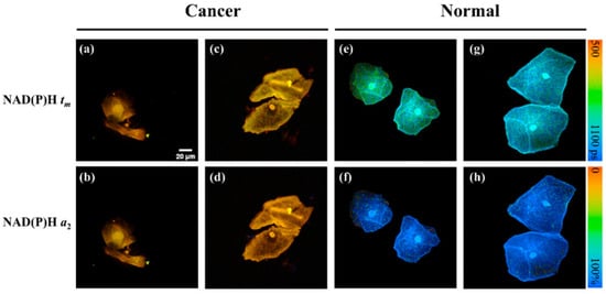 Each column shows the FLIM images of cervical cancer from four participants: One row represents tm value from the NAD(P)H, and another row shows the a2 values from NAD(P)H. Lifetime values are shorter in cancerous cells than in normal cells because cancer cells tend to undergo glycolysis rather than oxidative phosphorylation. (a−d) samples are from cervical cancer patients and (e−h) samples are from normal patient. Reprinted with permission from [38] under the terms of the CC BY 4.0 license.