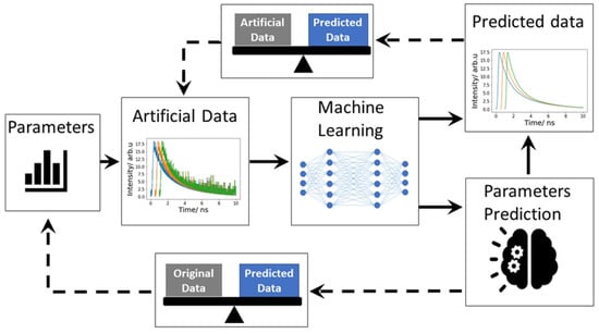This is the workflow of inverse modeling. First, a machine learning model was trained with artificial FLIM data. Artificial data mimic the real experimental data. To generate the artificial data, system response function (IRF) is convolved with an exponential function. Predicted parameters were compared with original artificial data. Finally, the machine learning model is tested with real data, measured data. Here, thick line represents the data generation and training method and dotted line represents the evolution process.