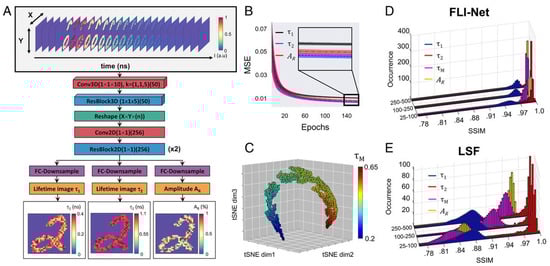(A) The architecture of FLI–Net. The input of the FLI–Net is 3D data cube. (B) MSE vs. epochs for lifetime 1, lifetime 2, abundance ratio. (C) t–SNE projection from the last activation map. (D) FLI–Net performance concerning structure similarity index (SSIM). (E) LSF performance concerning SSIM. From the plot, it is clear that FLI–Net performance is better than LSF. Reprinted with permission from [60] under the terms of the PNAS license.