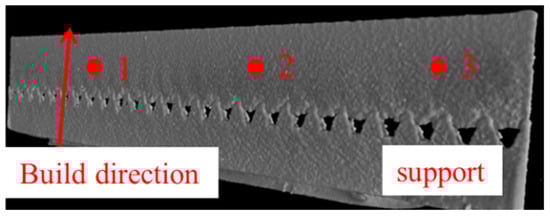Computed tomography image of the SLM flat specimen. The build direction shows how the specimen was built layer to layer on the process table. The red points are the measurement areas for the XRD analysis in Figure 2.