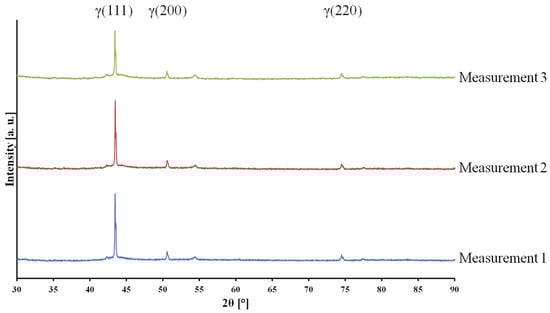 XRD diffraction patterns for SLM 316L specimens (parallel to the build direction). JCPDS 6-0696 for ferrite and JCPDS 4-0829 for austenite were used for the evaluation of the spectra.