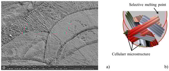 Microstructure analysis of SLM 316L by SEM showing (a) the cellular structure, and (b) a schematic drawing showing how various grains grow into the melt pool center with different angles.