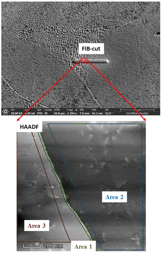 STEM image of a sub-grain boundary (outlined in green) and determination of the chemical composition (Table 2) in different areas using EDS analysis: Area 1 is the interface/grain boundary, in the green outlined area; Area 2 is the blue outlined area; and Area 3 is the red outlined area.