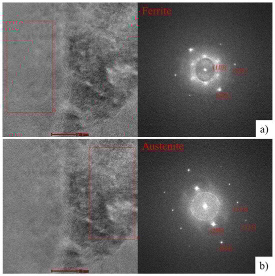 HR-TEM analysis with atomic resolution and their corresponding FFT patterns at the sub-grain boundary, as shown in Figure 5, reveals (a) the ferrite phase (with corresponding lattice planes) in the alloy-enriched region; (b) the presence of austenite (with corresponding lattice planes) in the unenriched region.