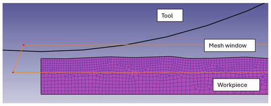 The mesh for the model was generated using the automatic meshing tool available in DEFORM 2D. The workpiece mesh had 6397 elements with 6886 nodes, and a mesh window was used to refine the elements along the expected contact area, as illustrated in Figure 2.