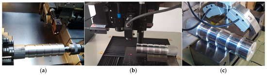 Theoretical studies were followed by physical experiments because the results of these can be used as baseline data to validate the simulation. My burnishing experiments were executed with an OPTIMUM type OPTIturn S600 CNC lathe (Figure 3a) with a PCD spherical burnishing tool (r = 3.5 mm). The kinematic viscosity of the manual dosed oil was υ = 70 mm2/s. This operation was preceded by a finishing turning set at f1t = 0.2 and then an f2t = 0.15 mm/rev feed rate.