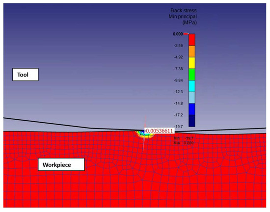 For the examination of residual stress, the configuration shown in Figure 4 was used for the evaluation of the simulation, where the first contact between the tool and the workpiece can be seen with the resulting compressive residual stress and its depth.