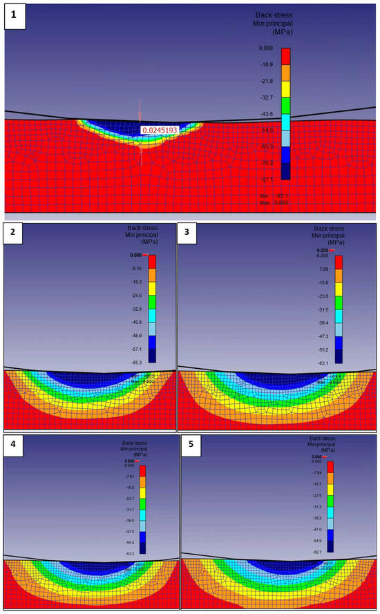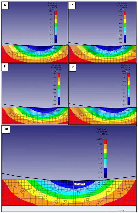 As was mentioned, the process of “loading-unloading-displacement” was repeated 10 times, and Figure 5 shows the distribution of the minimum principal residual stress for each full loaded step according to the 0.001 mm step.