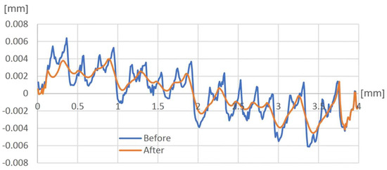 Among the evaluations, I first present the change in surface roughness caused by burnishing and compare the theoretical and experimental values. After running the simulation, the problem arose that the meshing distorted the original surface roughness (and thus the subsequent result), so it was necessary to remesh the workpiece with a larger number of elements and nodes. Due to this remeshing, the surface roughness changed from the physically measured 1.478 µm to 1.457 µm. In the DEFORM software, as the coordinates of the profile points can be inserted, they can be collected in a text/Excel file and the roughness parameters can be determined by applying the appropriate formulae. Scheme 1 shows the difference in the average surface roughness in millimeters between the turned meshed surface (before burnishing) and the burnished surface after running the simulation.
