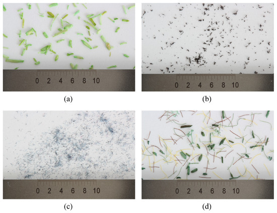 Figure 1. Test contamination, scale in mm: (a) d green artificial turf; (b) PE foam; (c) cotton fibers; (d) dark green artificial forest soil.