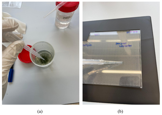 In a second trial, the particles were applied in a wet state—with better precision. To this end, a suspension of 2-propanol and the test particles was prepared, which was applied to the substrates by pipetting (0.5 mL per test area), as shown in Figure 2. A target of approximately 110 particles was favored for the application on the referenced field (area: 1764 mm2) in order to avoid errors of the automated particle counting devices. The maximum length of a single light green artificial turf particle (a) was assumed by 4 mm, so that 110 bounding boxes would fit into the referenced field. On the other hand, a lower amount would have had adverse effects for the calculations.