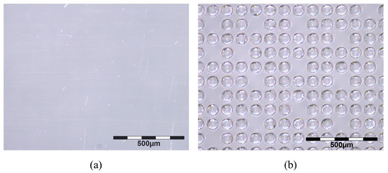 Cleaning efficacy was evaluated by counting the test particles before and after cleaning. For this, optical measuring systems were used, which can automatically count the particles on the surface of the substrate [33,34]. A reflected light microscope and a grazing light measuring device were favored [35]. Original lightguides taken from series production were used as substrates. Lightguides were used in LCD displays, i.e., as digital dashboards for vehicles. The light emitted from the diodes (LED) at the edge/side of the lightguide is focused and directed to its destination by the micro lens arrays on the lightguide [36]. The lightguide has a smooth and a rough (diffuse) side, with micro lenses of approx. 100 µm in diameter (see Figure 3b). The cleaning validation was originally carried out on both sides of the lightguides. The smallest particle size measured (Feretmax [37]) was defined as 100 µm—based on the cleanliness requirement. However, with the chosen measurement systems, it was not possible to differentiate between micro lenses and particles in the size range of 100 µm (see Figure 3b and Figure 4b), so the cleaning validation was only carried out on the smooth side. According to the inline quality control during series production, the lightguides were all free of defects. Under the light microscope, however, microscopic scratches were visible on the smooth side (see Figure 3a). The light microscope identified these micro-scratches as particles, rendering an automated evaluation of the smooth side with the light microscope impossible.