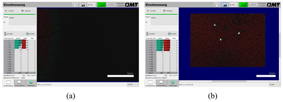 The grazing light measuring device PartSens 4.0 (supplier: OMT GmbH, Schafwäsche 8, 71296 Heimsheim, Germany) proved to be more robust with regard to micro-scratches than the light microscope. The zero measurements (measurement of the smooth side, without test particles) only showed artifacts ≤ 50 µm (see Figure 4a). Thus, selectivity was sufficient to distinguish the smallest particles to be measured (see Figure 4a). This could also be verified after a simulated cleaning step. In this case, all test areas were wiped with a damp cleaning cloth and then subjected to a second zero measurement. The simulated cleaning process corresponded to Step (I)—as described in Section 6.
