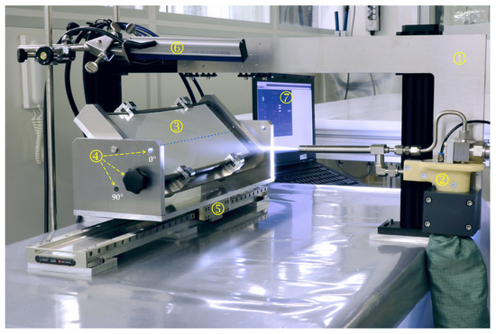 The cleaning tests were carried out in a cleanroom with air cleanliness class ISO-1 [38] so as to exclude disturbing environmental influences. The test setup consisted of a (1) movable carriage to which the (2) handle with nozzle for extra clean dry air (xCDA, cleanliness classes [0:1:0] according to ISO 8573 [39]) or carbon dioxide snow (CO2) was mounted (see Figure 5). CO2 could be added to the xCDA medium at the touch of a button. The nozzle geometry and the pressure (6.0 bars) were therefore identical in all tests. The (3) lightguide is fixed in a (4) bracket with locking holes for the fixed tilt positions 0°, 45° and 90°. The bracket is fixed to the carriage of the (5) linear axis. There are two (6) line ionizers above the active cleaning zone. The speed of the linear axis is set via the (7) control software.