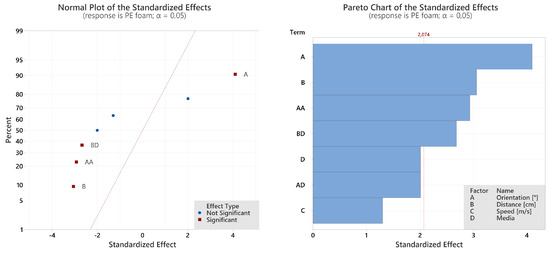 The interactions of the main and secondary effects for PE foam and the cotton fibers were investigated. The results of the two artificial turf particles were not evaluated. The particles sedimented faster, which meant that a lower quantity of particles was applied. A higher statistical uncertainty was expected here, having a negative effect on the regression. Although the results with the cotton fibers are based on a better regression model (R2 = 90.27 %), the results with PE foam (R2 = 76.27 %) will be discussed in more detail below, as these test contaminants are original (i.e., they are identical to the naturally occurring contaminants). In both cases, the regression models were optimized—before evaluation—with regard to the residues in order to achieve a better fit. Quadratic interactions with a p-value > 0.250 were eliminated to increase R2. Figure 9 shows which effect has a significant impact on the regression model with the PE foam particles. The cleaning efficacy is influenced in turn by the following effects: A: Orientation, B: Distance, AA: Orientation2, BD: Distance×Media. It is noteworthy that the main effect, Distance*Media, has no significant influence according to the regression model. Looking at the primary data (see Figure 8), only CO2 achieves 100 % cleaning efficacy. The cotton fibers, on the other hand, appear to adhere more strongly to the substrate, which is evident from the lower cleaning efficacy. It seems that the smaller and/or flatter the particles become, the more difficult they are to remove [43,44,45].