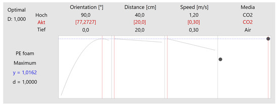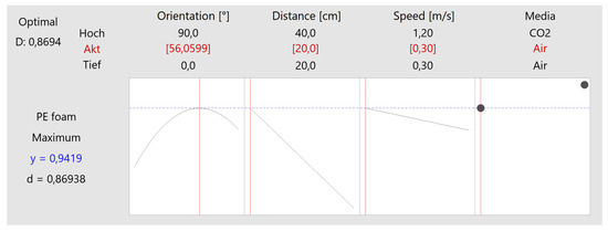 This optimization could only be carried out within the limits of the model (parameter sets). However, it can be assumed that an even better cleaning efficacy can be achieved if the distance/speed is further reduced. By comparison, only a cleaning efficacy of 94.19% is achieved with air under optimal conditions (corresponding approximately to 3σ or Cp = 1.00), as shown in Figure 13.
