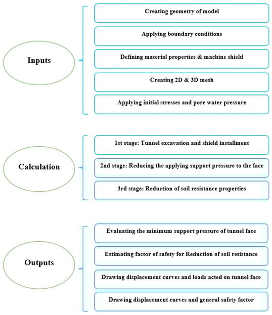 This paper utilizes Plaxis 3D (2020) Tunnel software to analyze the stability of the tunnel face. The process consists of four key steps: input, calculation, output, and curve generation. Each of these steps requires specific performance stages, as illustrated in Figure 10, for the appropriate model. In the finite element simulations, the soil was modeled as an elastic perfectly plastic (elasto-plastic) material, adhering to the Mohr–Coulomb failure criterion. Despite its limitations, this constitutive model has been previously evaluated and found sufficiently accurate for determining the tunnel face support pressure at failure [,].