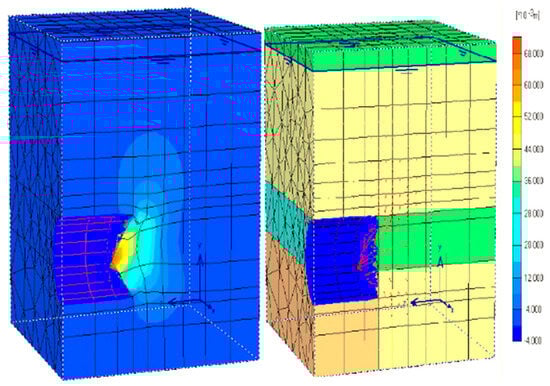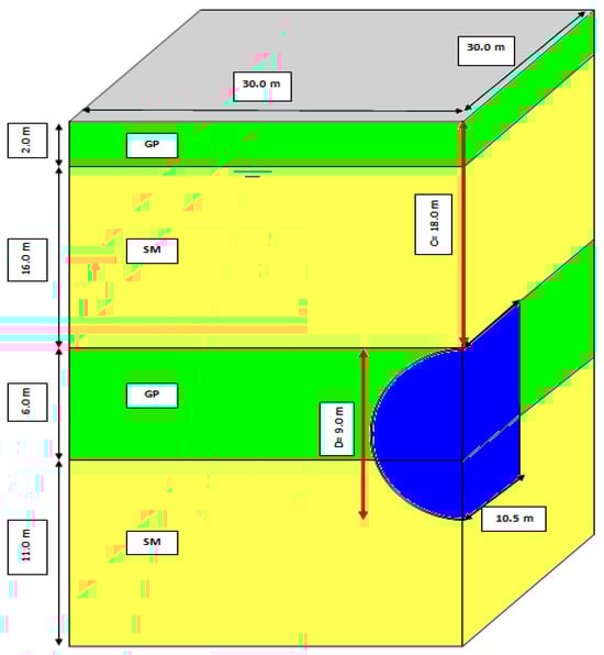 This section discusses the geometry, boundary conditions, meshes, and construction stages used in all the numerical analyses. The model geometry, as shown in Figure 11, considers a height of 35 m (comprising four layers), a width of 30 m, and a length of 30 m in the Z direction. These dimensions ensure that the model is large enough to accommodate any failure mechanism while minimizing the boundary effects. To optimize the model volume and calculation time, only half of the tunnel and shield machine were modeled, leveraging symmetry in both geometry and boundary conditions. The model’s boundary dimensions were carefully selected by analyzing different boundary sizes and comparing the results, in line with Ruse’s recommendations, to ensure they did not impact the face collapse pressure. The tunnel, with a diameter of 9.45 m and an axis located 22.5 m below the surface, was designed with an overburden-to-tunnel-diameter ratio of 2. The water table is positioned two meters below ground level, and the surface load is assumed to be zero. Soil resistance properties were considered for the gravel layers (c = 2 kPa, φ = 35°) and sandy-silty layers (c = 10 kPa, φ = 30°). The bottom face of the model is completely restricted, preventing any movement, while the ground surface is left unrestricted and free to shift. The vertical boundaries on the sides of the soil box are constrained solely in the direction perpendicular to their surface, with horizontal displacements controlled using roller supports. The Mohr–Coulomb failure criterion is utilized for the soil modeling. The soil’s elastic characteristics, represented by Young’s modulus and Poisson’s ratio, are incorporated. However, it is important to note that these elastic parameters have minimal influence on the stability analysis outcomes. Based on the elevation of the layers, appropriate material groups are assigned to each corresponding layer. The tunnel lining is modeled using shell elements, while interface elements adhering to Coulomb’s law establish the connection between the lining and the surrounding soil. Normal stiffness (Kn) and shear stiffness (Ks) are attributed to the interface, determined by the stiffness of adjacent elements. These parameters have minimal impact on the precision of this type of stability analysis, ensuring reliable results. Moreover, symmetry was used to optimize the computations, and roller supports constrained displacements at vertical boundaries. Additionally, the boundary size was analyzed following Ruse’s recommendations to ensure it did not impact the calculated collapse pressure, confirming that the edge influences were effectively controlled.