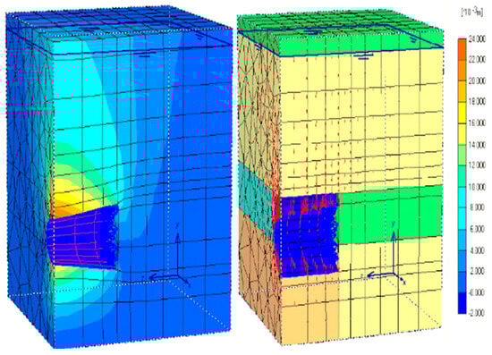 The first stage involves soil excavation to allow the shield to penetrate, lowering the water level in the machine, applying pressure to the tunnel face, and simulating convergence to model the conical shape of the shield (due to the reduction in shield diameter from the face to the rear). This stage focuses on the stability of the tunnel face heading, considering the shield’s advancement over a length of 10.5 m. At this point, the support pressure, determined through empirical or analytical methods—277 kPa from the COB—is applied as the base pressure to the tunnel face. Figure 12 depicts the general displacements following this initial stage of tunnel excavation, showing that the applied pressure was sufficient to cause only partial displacements in the face, with the conical shield’s effect on ground convergence clearly visible.