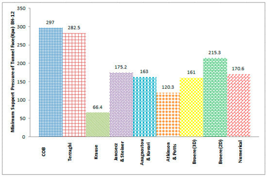Comparing the values resulting from empirical, analytical, and numerical approaches for the support pressure of tunnel face in BH-12.