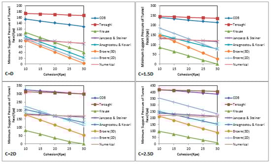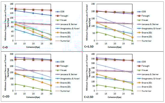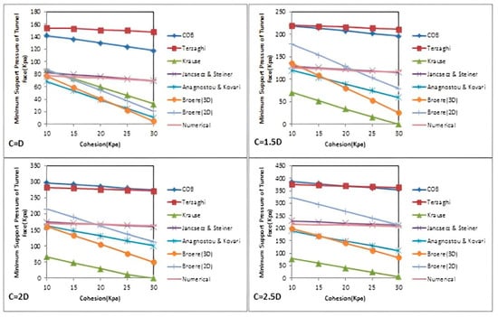 Figure 17 shows the effect of cohesion (10–30 KPa) on the minimum support pressure required at the tunnel face for different depths (C = D, C = 1.5D, C = 2D, and C = 2.5D) in EPB tunneling. As the cohesion increases, the support pressure consistently decreases for the numerical methods and advanced analytical models [,,], with the numerical approach showing the most significant reductions. In contrast, the COB and Terzaghi methods remain nearly constant and conservative, ignoring the cohesion’s influence. At greater depths (C = 2.5D), the required support pressure is higher, but the effect of the cohesion becomes more substantial, further emphasizing the importance of accurate methods like numerical simulations for practical and optimized tunnel face support design.