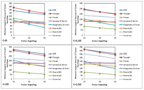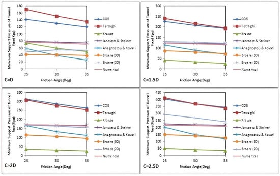 Figure 19 demonstrates the effect of the friction angle (25–35°) on the minimum support pressure at the tunnel face for different depths (C = D, C = 1.5D, C = 2D, and C = 2.5D) in EPB tunneling. As the friction angle increases, the minimum support pressure decreases across all the depths, with the numerical method and advanced approaches (e.g., [,,]) showing significant reductions. The COB and Terzaghi methods remain conservative and less sensitive to the friction angle. At greater depths (C = 2.5D), the overall support pressures increase, but the effect of the friction angle becomes more pronounced, highlighting its role in reducing the required support. This emphasizes the importance of using advanced analytical and numerical methods that account for the friction angle’s contribution to tunnel stability.