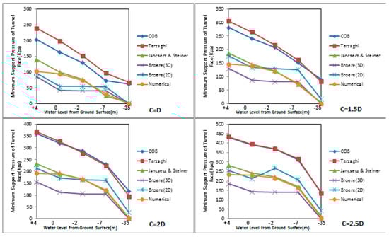 Figure 20 illustrates the relationship between the minimum support pressure of a tunnel face and varying water table depths for a sandy layer with cohesion of 30kPa and a friction angle of 20°. As the water table drops from +4 m to −35 m (dry conditions), the pore water pressure decreases, increasing the effective stress and friction between the soil grains. This enhances the soil’s arching ability, reducing the support pressure required at the tunnel face. The results consistently show that tunnels at shallow depths (C = D) require lower support pressures compared to deeper tunnels (C = 2D and C = 2.5D) due to the increasing overburden stress with depth. The deepest tunnels (C = 2.5D) exhibit the highest support pressures, even as the water table is lowered, indicating the compounded effect of depth and stress. The comparison of the results from the numerical simulations, theoretical methods (COB, Terzaghi, Janacek & Steiner), and Broere’s models [] (2D and 3D) reveals distinct trends. Terzaghi’s method consistently predicts higher support pressures, particularly for deep tunnels, making it more conservative. The numerical simulations align closely with Broere’s 3D results, especially for greater depths, and show good agreement with the findings of Anagnostou and Kovári []. As the tunnel depth increases, the dependency on accurate methods becomes more critical, as deeper tunnels require significantly higher support pressures. The study highlights the importance of both tunnel depth and water table position in determining support pressures, emphasizing that reduced pore water pressure due to a lower water table can improve soil stability and minimize the necessary support forces.